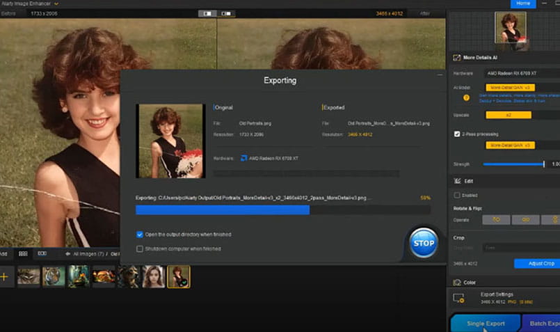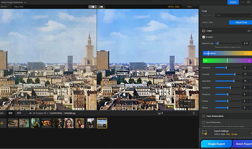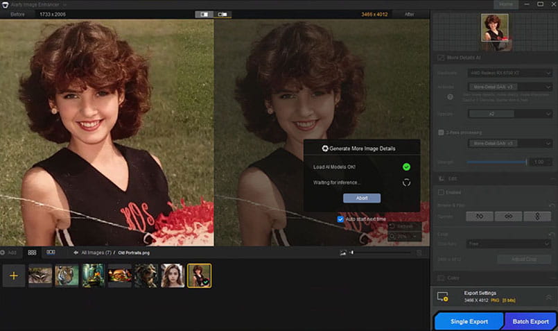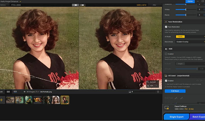 Compare before/after results and tweak settings for the most natural outcome. Save your restored images in high-quality formats like PNG or TIFF. Then choose Export Current for a single image or Batch Export for multiple photos.