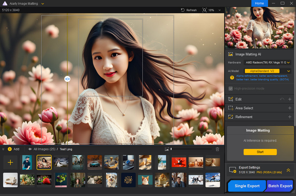 Aiarty Image Matting employs 4 sophisticated AI models to precisely detect and extract subjects from even the most complex backgrounds. Whether you’re dealing with intricate textures, low-contrast images, or highly detailed subjects, its AI algorithms ensure clean and accurate background removal. For even greater precision, you can manually select the exact area you want to extract.