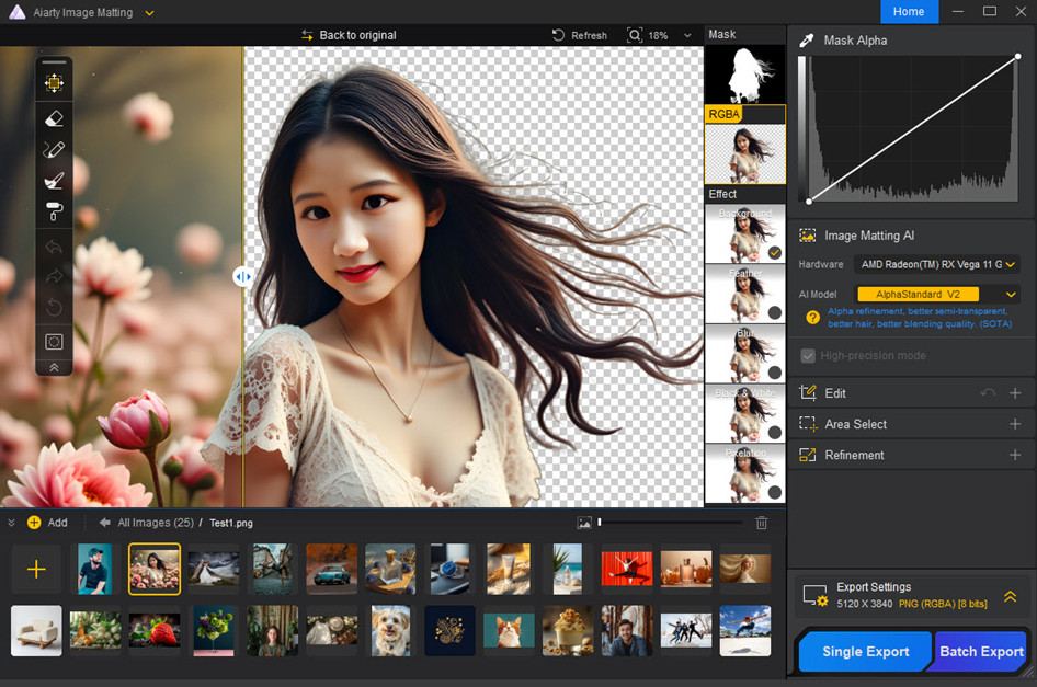 Aiarty Image Matting is more than a simple background remover. It combines advanced AI matting models, edge refinement technology, and batch processing capabilities, and more to accurately remove backgrounds from images while preserving fine details such as hair, fur, and transparent objects.