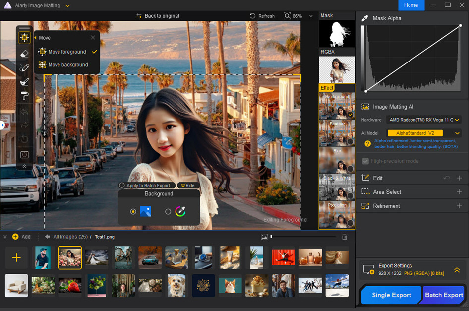 Once satisfied, export your transparent background image. You can process single images or multiple images at once for batch output.