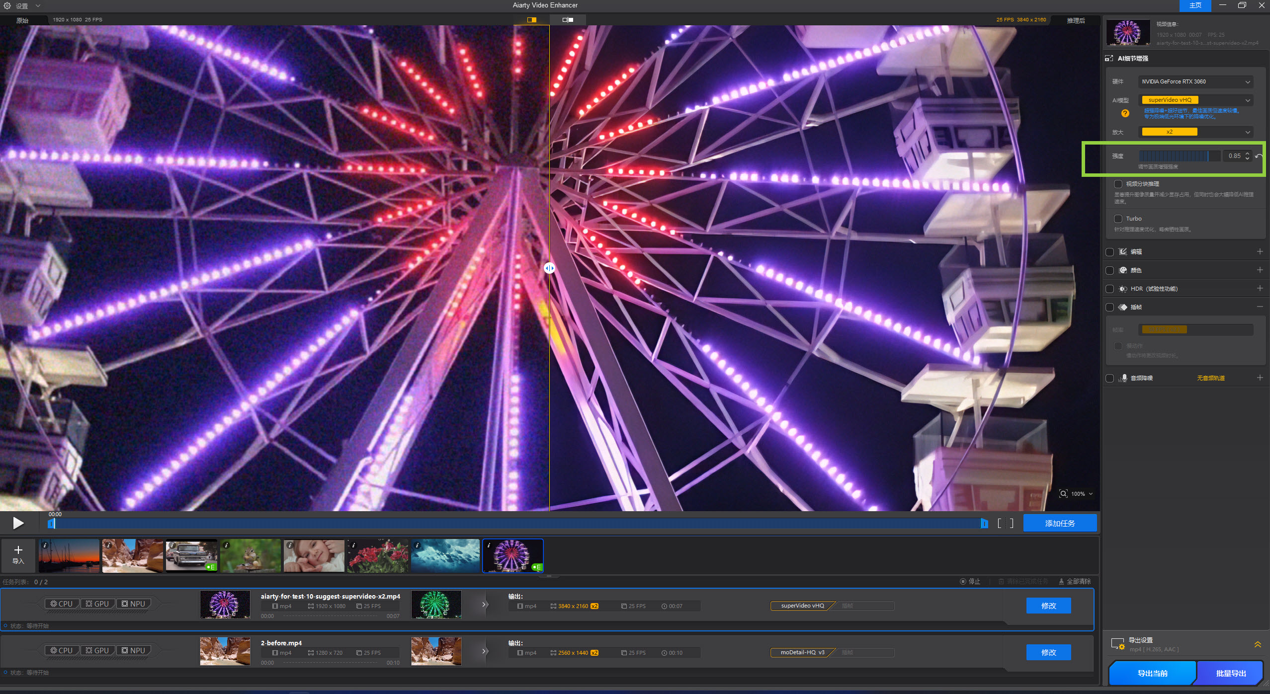 “强度”滑块可控制 AI 对视频增强的力度,范围从 0 到 1。你可以在轻微清理与更明显的锐化、细节增强之间进行精确平衡,在提升清晰度的同时保持真实自然的观感。不同视频差异较大,建议多加尝试,找到最适合当前素材的设置。