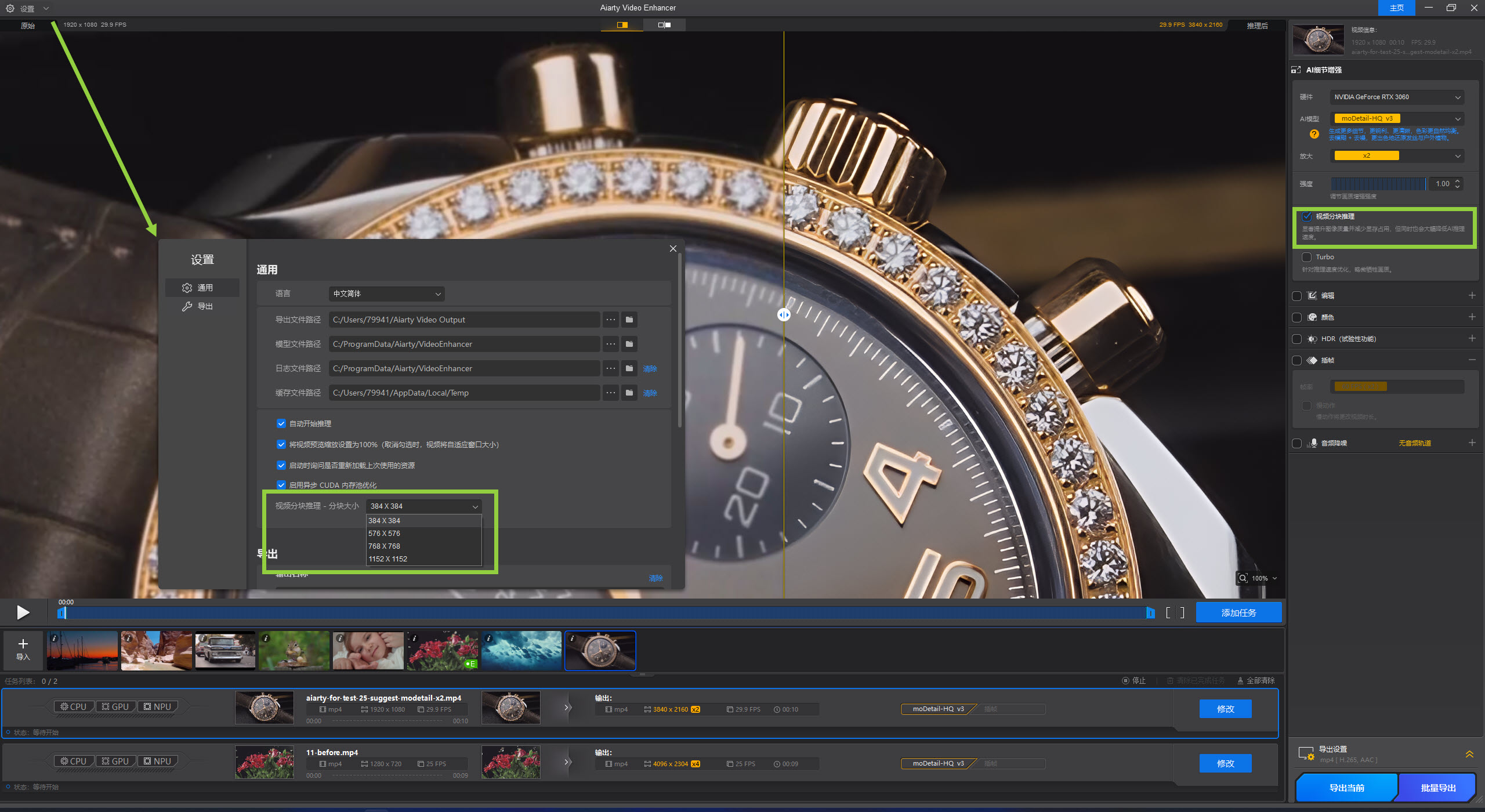 对于高分辨率视频,视频分块推理通过分块式 AI 推理进一步提升清晰度和细节表现。该方式可显著降低显存占用,同时保持画面一致性。虽然速度不及 Turbo 模式,但在复杂素材上可获得更干净的效果。