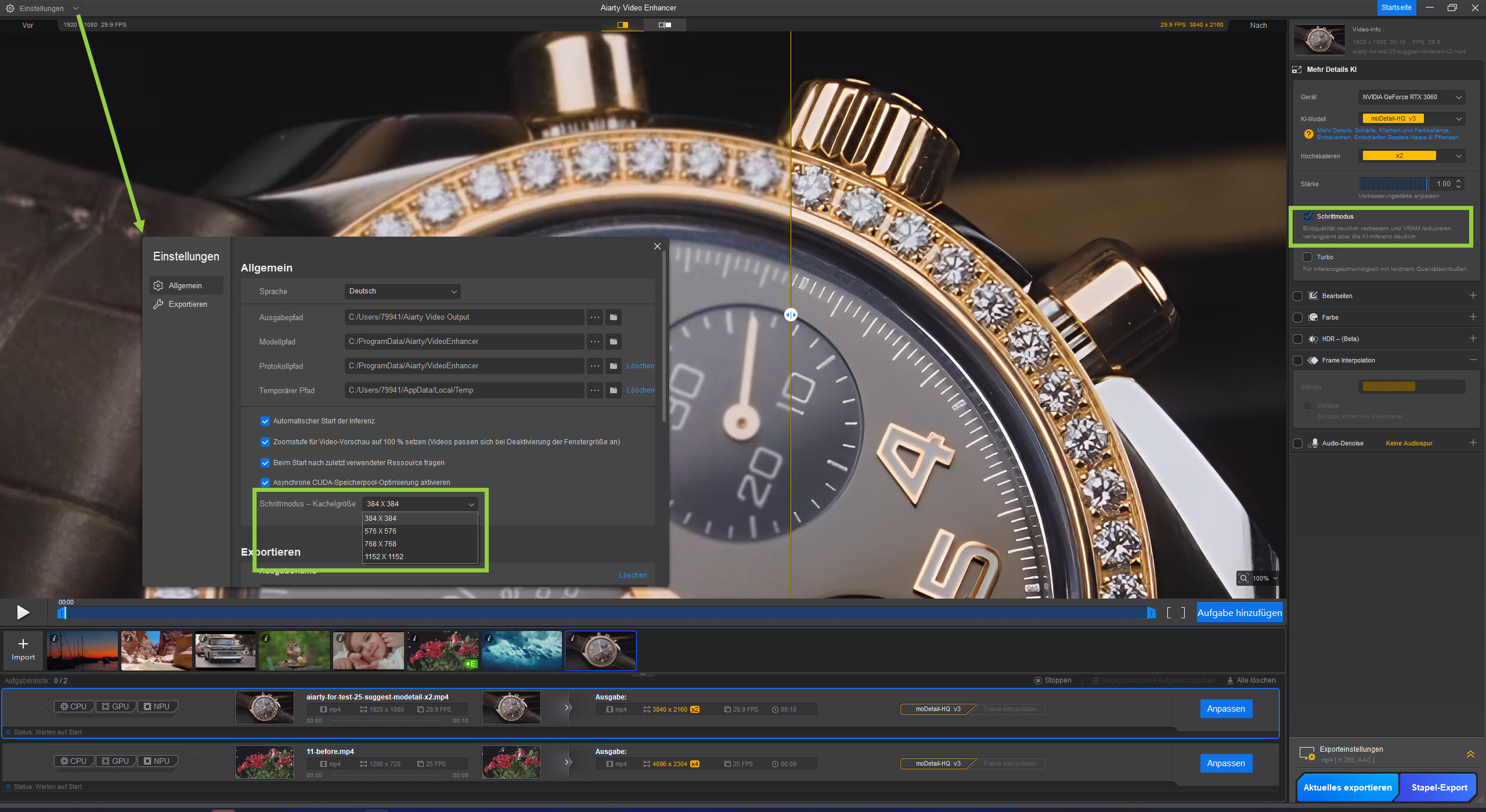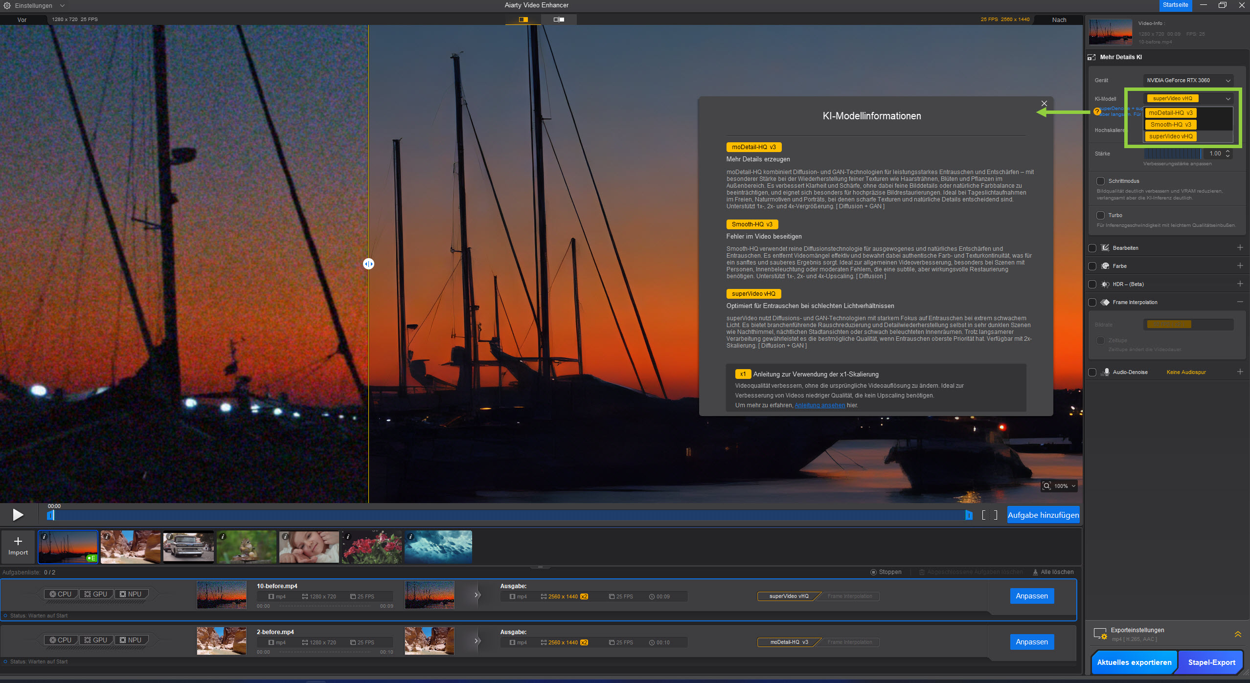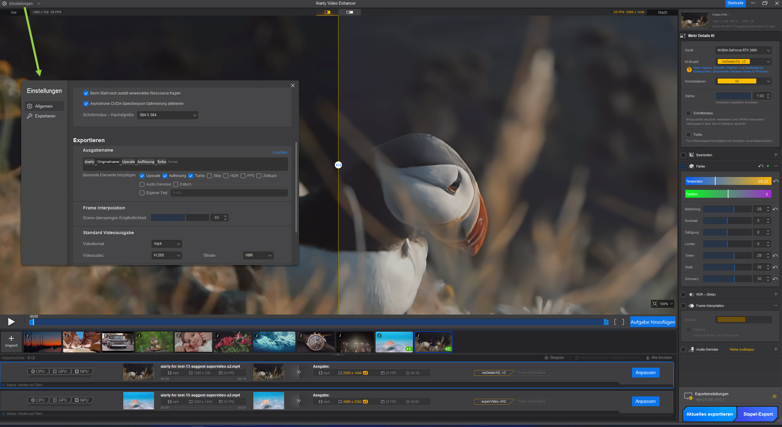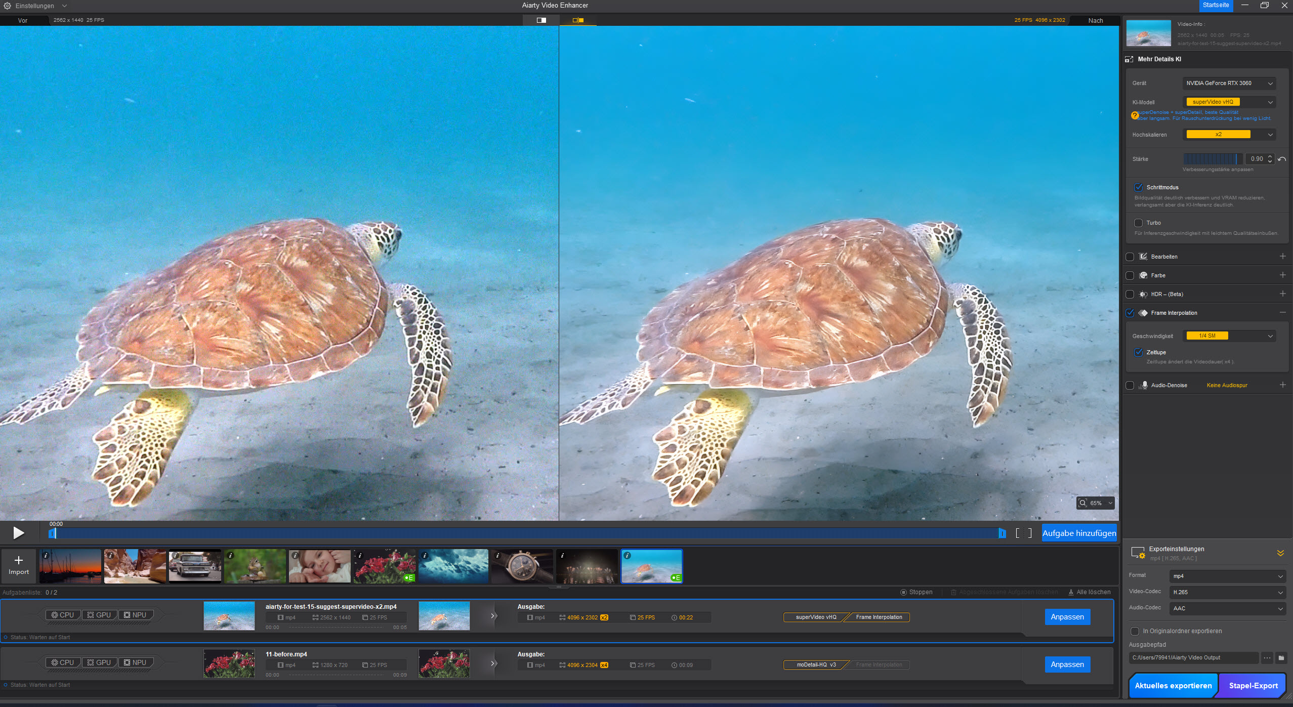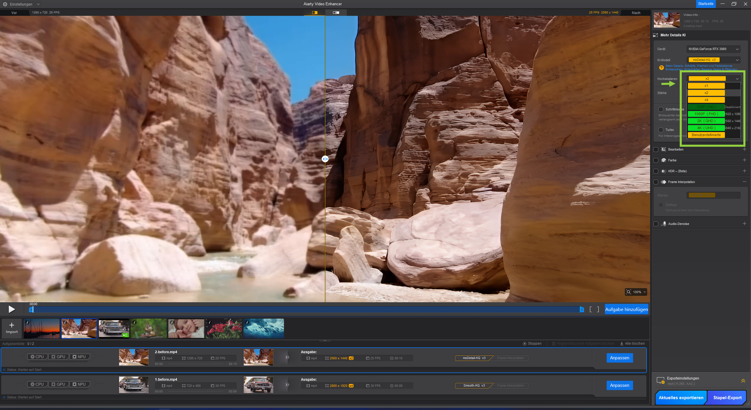 Befolgen Sie die folgenden Empfehlungen entsprechend Ihrer Prioritäten – ob Bildqualität, Geschwindigkeit oder Farben. Sie müssen nicht jede Funktion in der Benutzeroberfläche aktivieren; Funktionen wie Frame Interpolation oder Audio Denoise sind beispielsweise nicht erforderlich, wenn Sie ein Video lediglich hochskalieren.