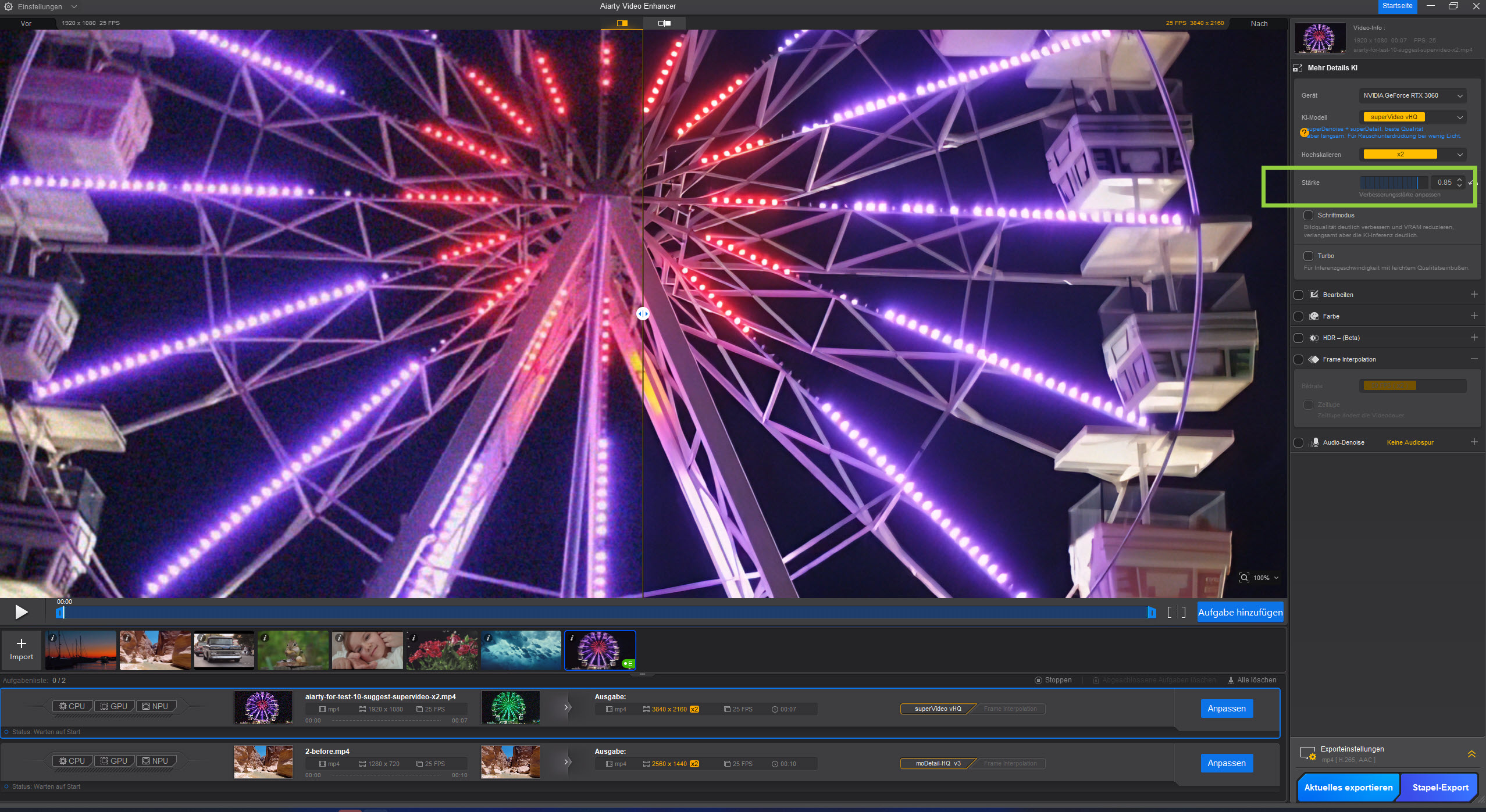 Mit dem Stärke-Regler bestimmen Sie, wie intensiv die KI Ihr Video verbessert. Der Wertbereich von 0 bis 1 ermöglicht eine präzise Anpassung – von dezenter Bereinigung bis hin zu stärkerer Schärfe und Detailverstärkung. Nutzen Sie ihn, um mehr Klarheit zu erzielen und gleichzeitig ein natürliches, realistisches Erscheinungsbild zu bewahren. Da jedes Video anders ist, empfiehlt es sich, verschiedene Einstellungen zu testen.