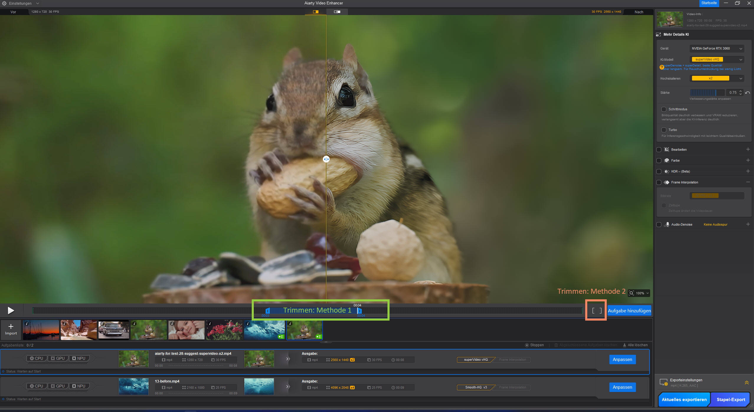 Wählen Sie einen kurzen Abschnitt von 5–10 Sekunden aus einem anspruchsvollen Teil Ihres Videos, um Einstellungen zu testen, bevor Sie das gesamte Projekt rendern. Dafür stehen zwei Methoden zur Verfügung: