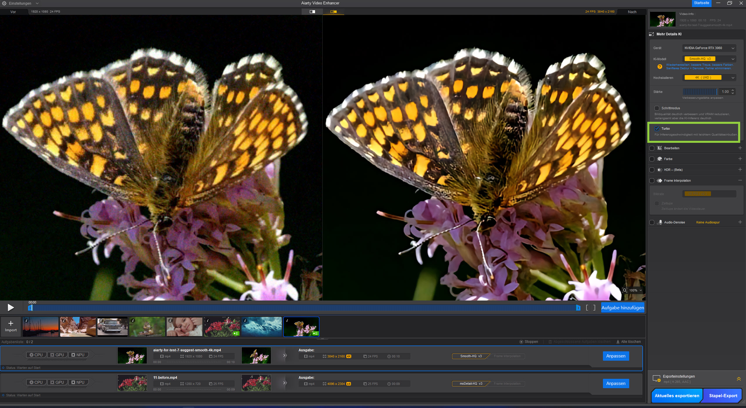 Bei hochauflösenden Videos ermöglicht der Step Mode eine noch höhere Klarheit und Detailtreue durch kachelbasierte KI-Berechnung. Diese Methode reduziert den VRAM-Verbrauch erheblich und sorgt gleichzeitig für eine gleichmäßige Bildqualität. Zwar ist Step Mode langsamer als der Turbo-Modus, liefert jedoch sauberere Ergebnisse bei anspruchsvollem Material.