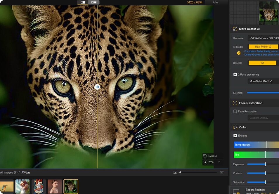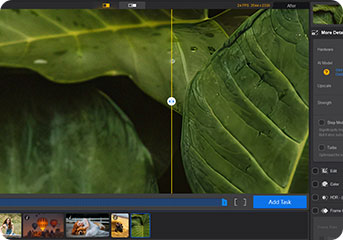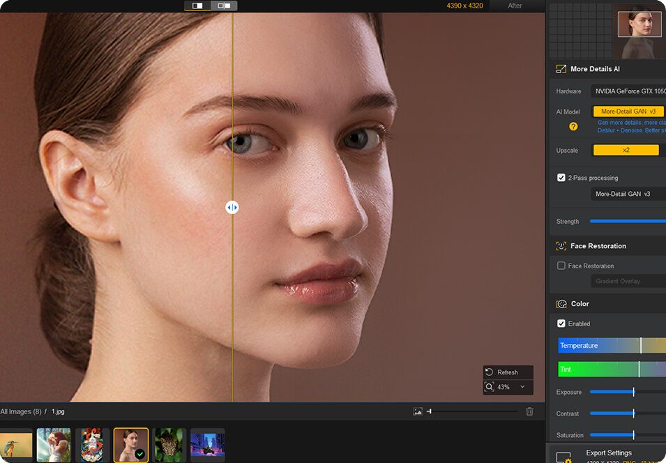 - Batch enhance with natural, lifelike detail and upscale up to 32K.