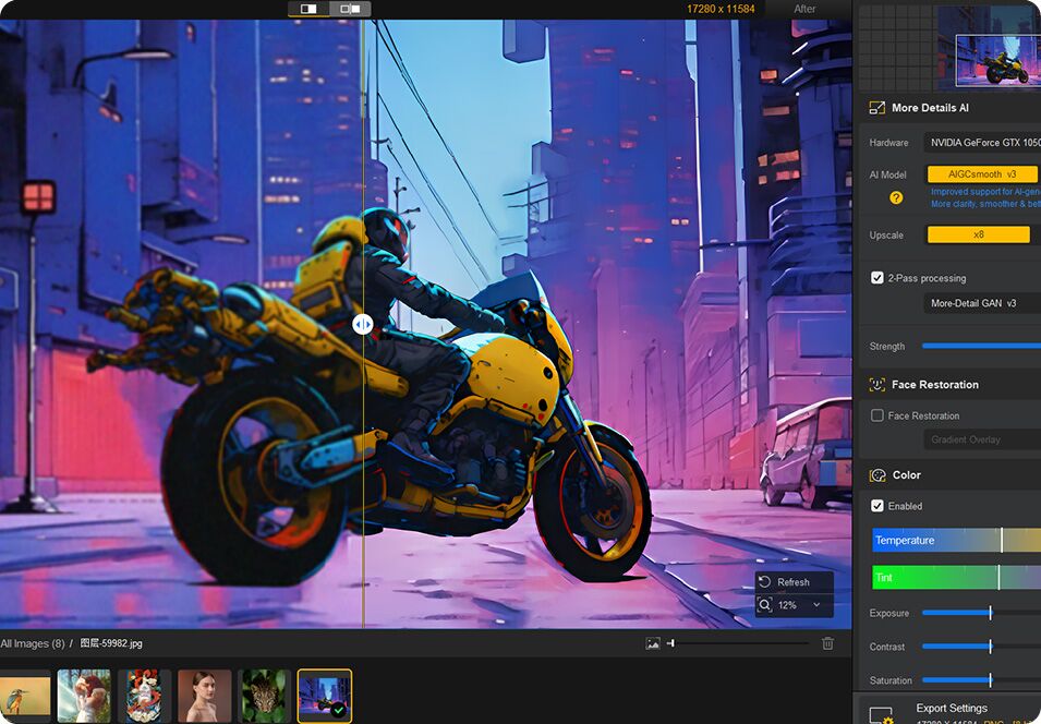 Aiarty uses deep learning to upscale & enhance to reduce noise, compression & blur while preserving vibrant colors and natural textures all without grid artifacts.
