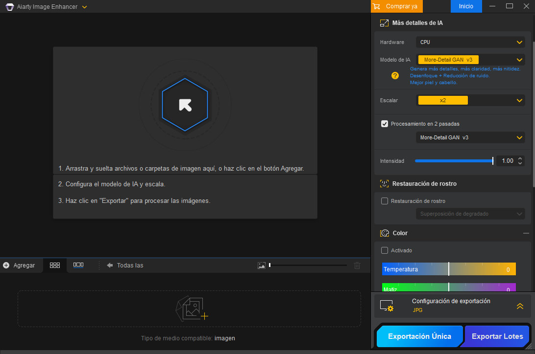 Descarga Aiarty Image Enhancer para mejorar/escalar tus imágenes y fotos por lotes ahora.