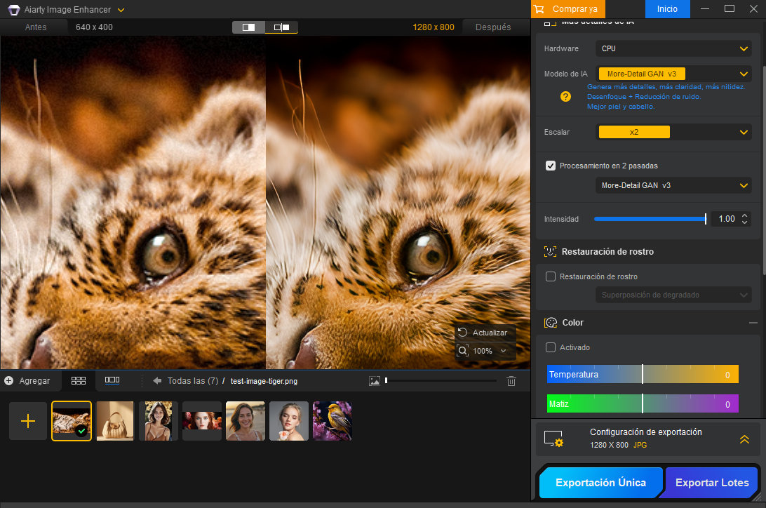 Los diferentes modelos de IA en Aiarty Image Enhancer sirven para diferentes propósitos, así que elige el modelo correcto para tu fuente de imagen. Si necesitas mejorar la calidad de la imagen sin aumentar la resolución, selecciona 1x, que tiene un mejor efecto de mejora/restauración. Además, nuestro software respeta el estilo y color original de tus imágenes, por lo que es posible que no veas cambios exagerados. Después de la mejora, haz zoom en la imagen de salida para compararla con la original y ver la diferencia.