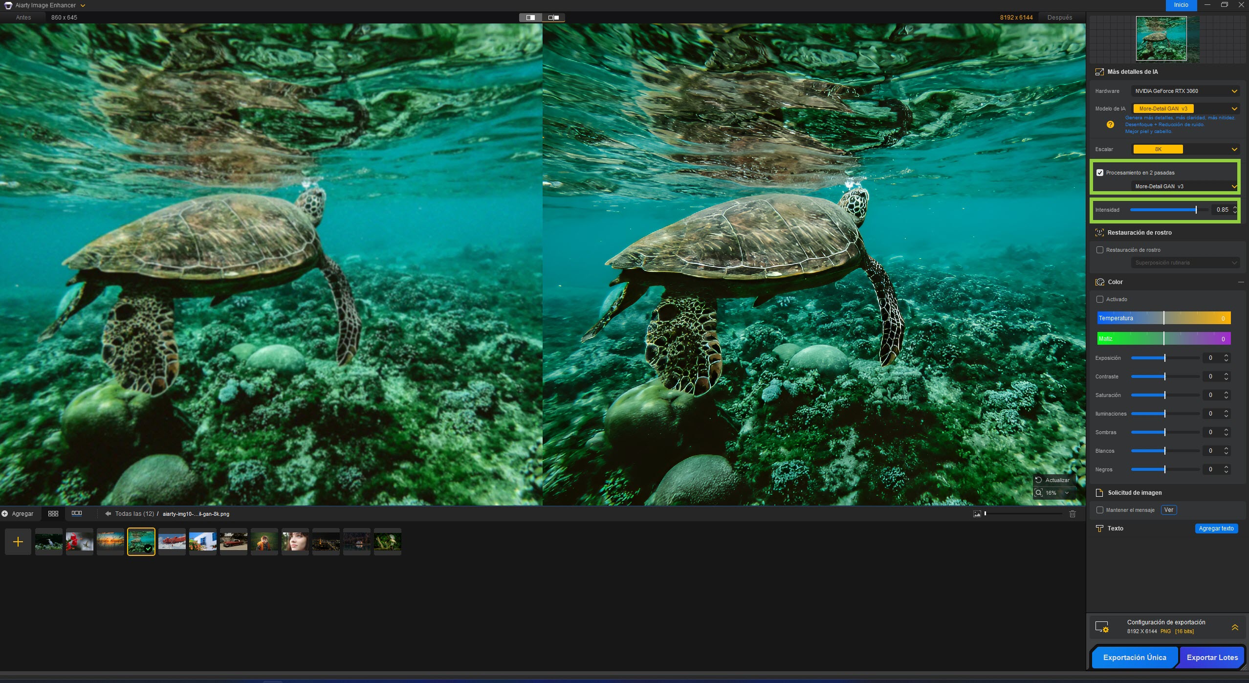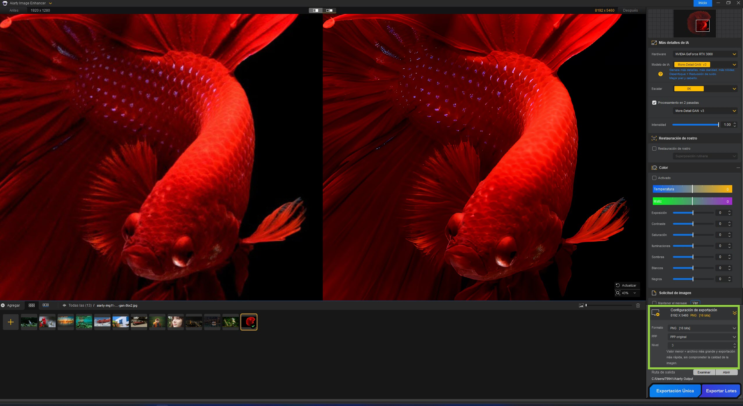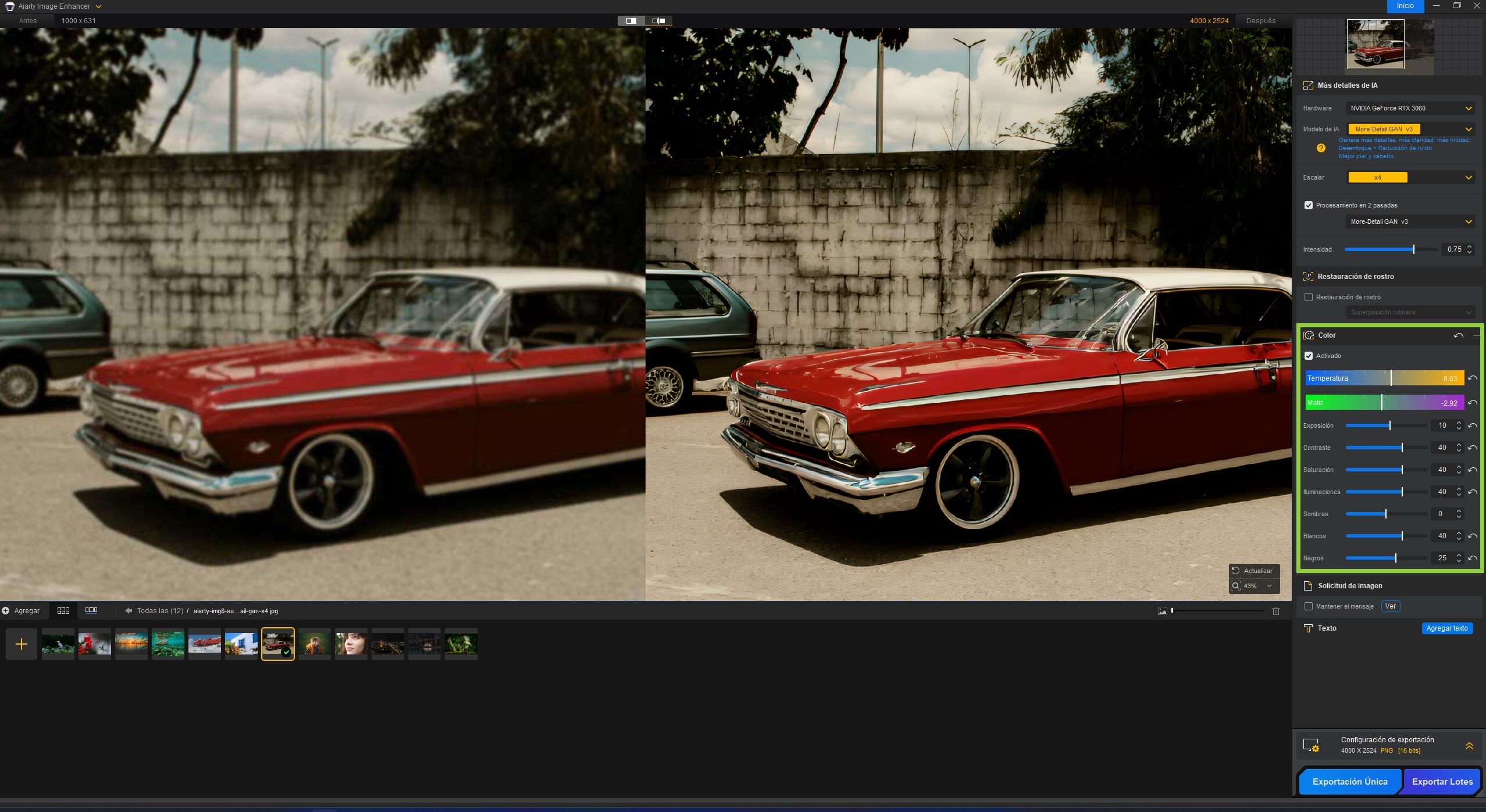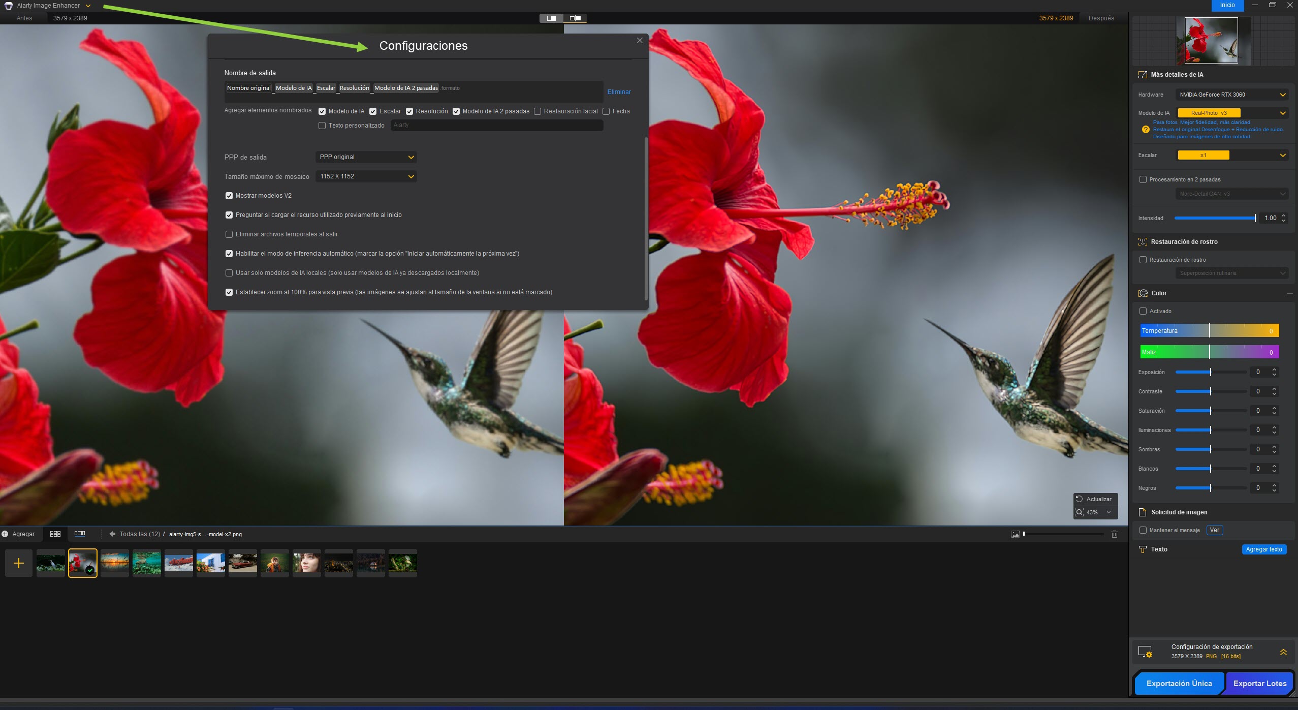 Ten en cuenta que algunas imágenes pueden requerir configuraciones diferentes. Puedes reajustar las opciones en Configuración o directamente en el panel de trabajo antes de exportar tus imágenes para lograr los mejores resultados.
