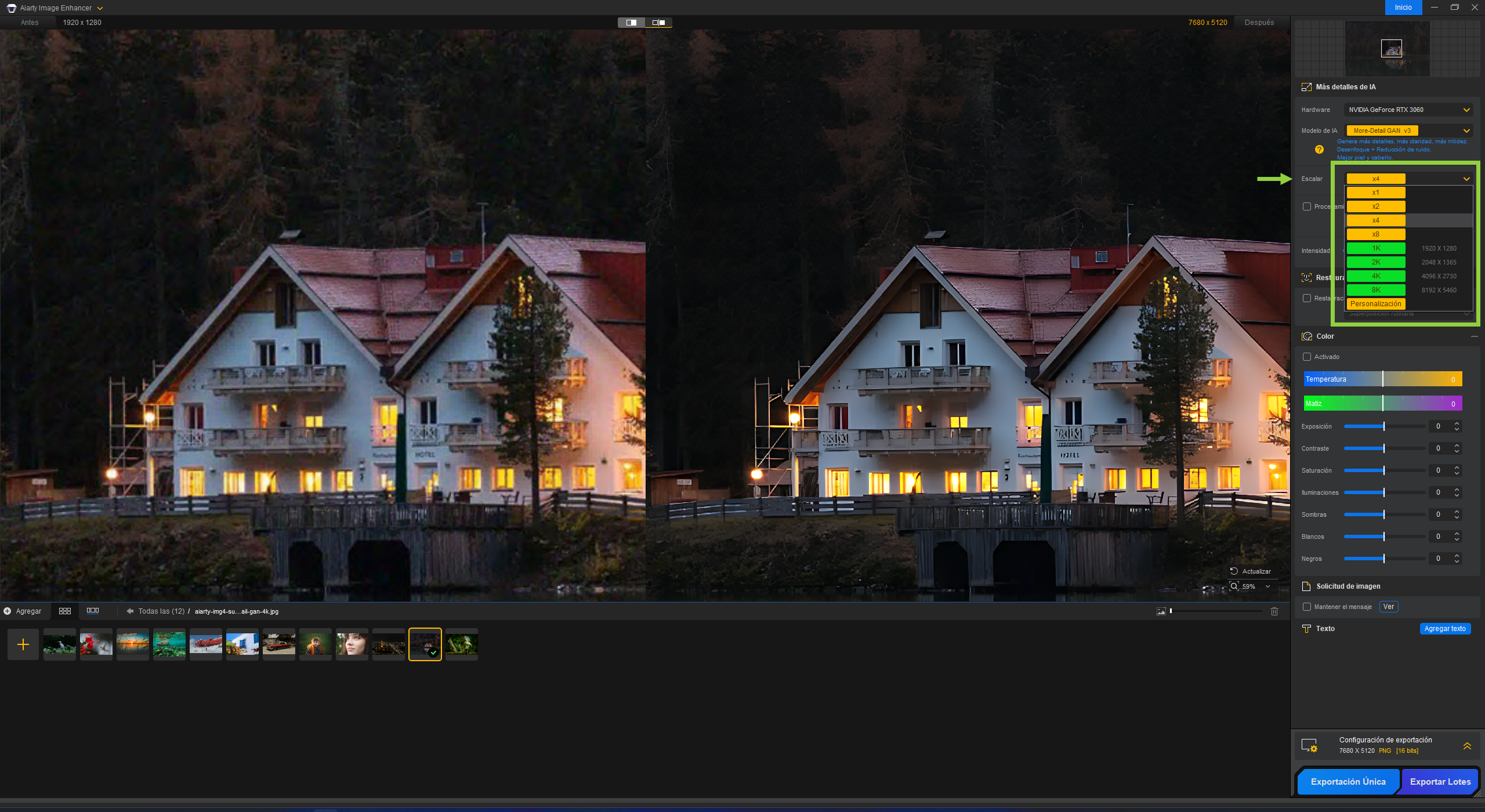 ▪ Evita saltar directamente al mayor escalado: a veces escalar paso a paso (ej. ×2 luego otro ×2) produce mejores resultados que un escalado directo ×4/x8 o 4K/8K.