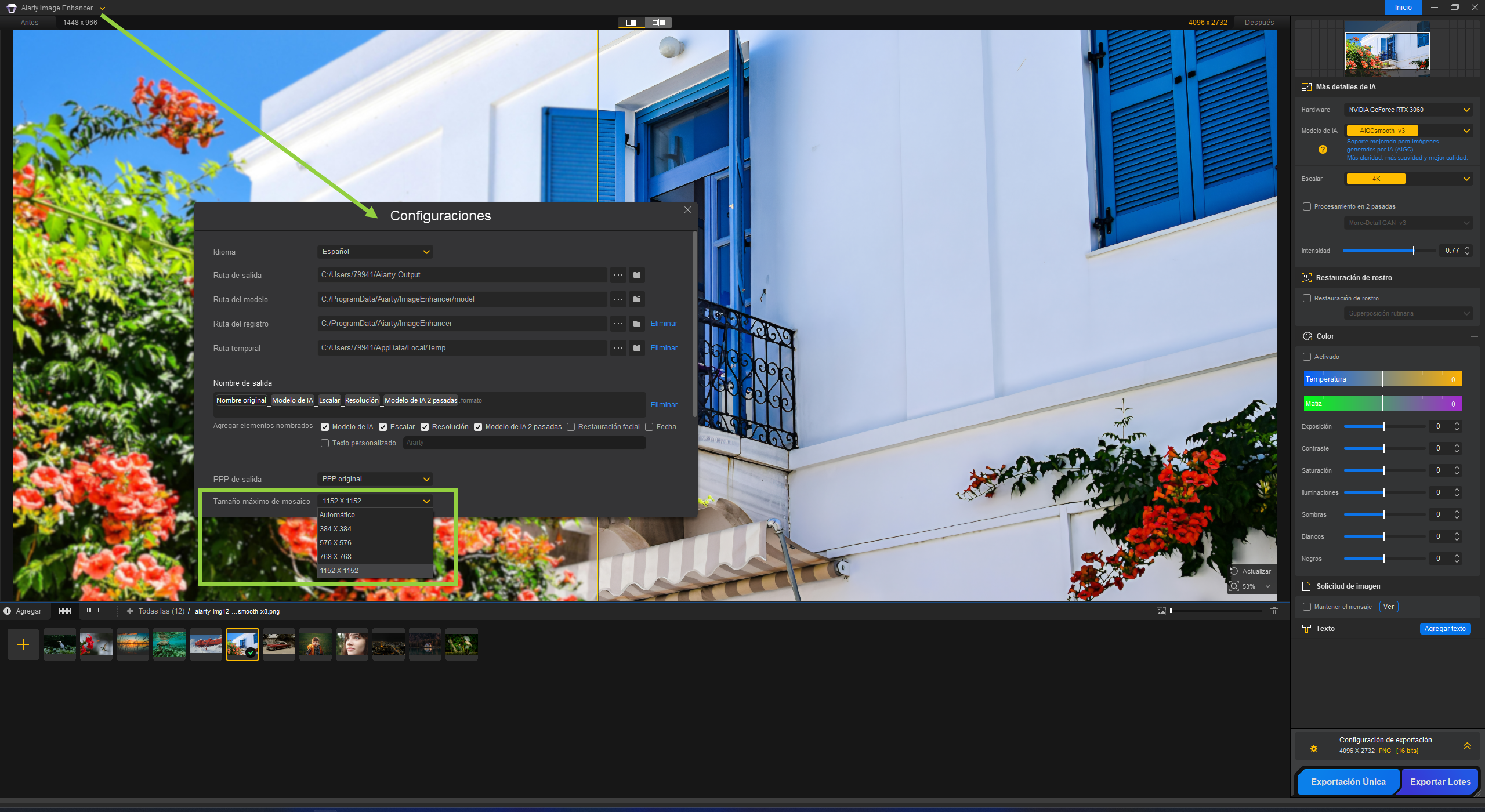 Puedes ajustar el Tamaño máximo de mosaico en Configuración para equilibrar velocidad, uso de memoria y calidad de salida según tu hardware y tamaño de imagen.