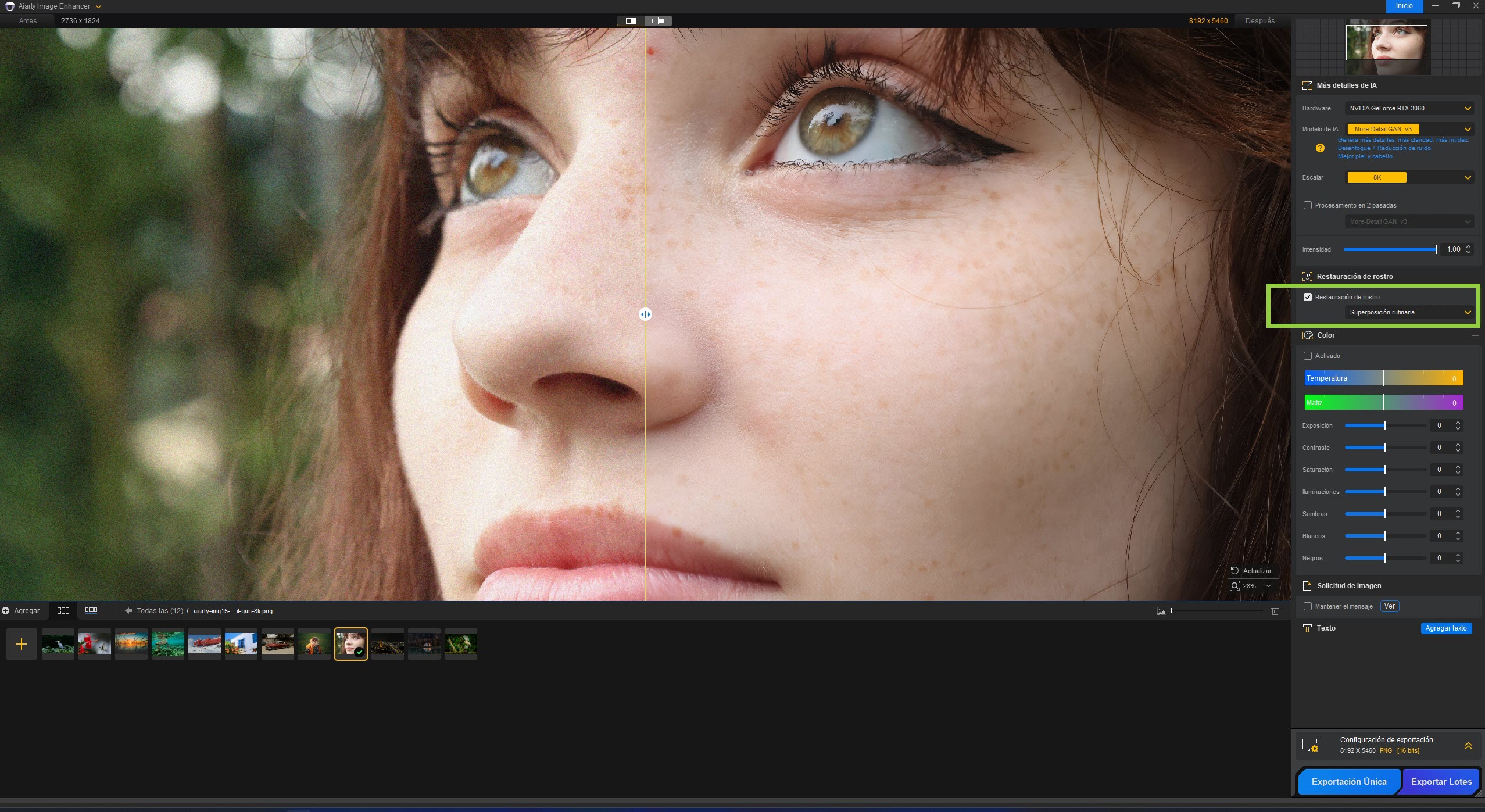 Restauración de Rostro: Restaura detalles faciales analizando características y refinando la textura de la piel, eliminando imperfecciones, acné, enrojecimiento, pecas, desenfoque y ruido.