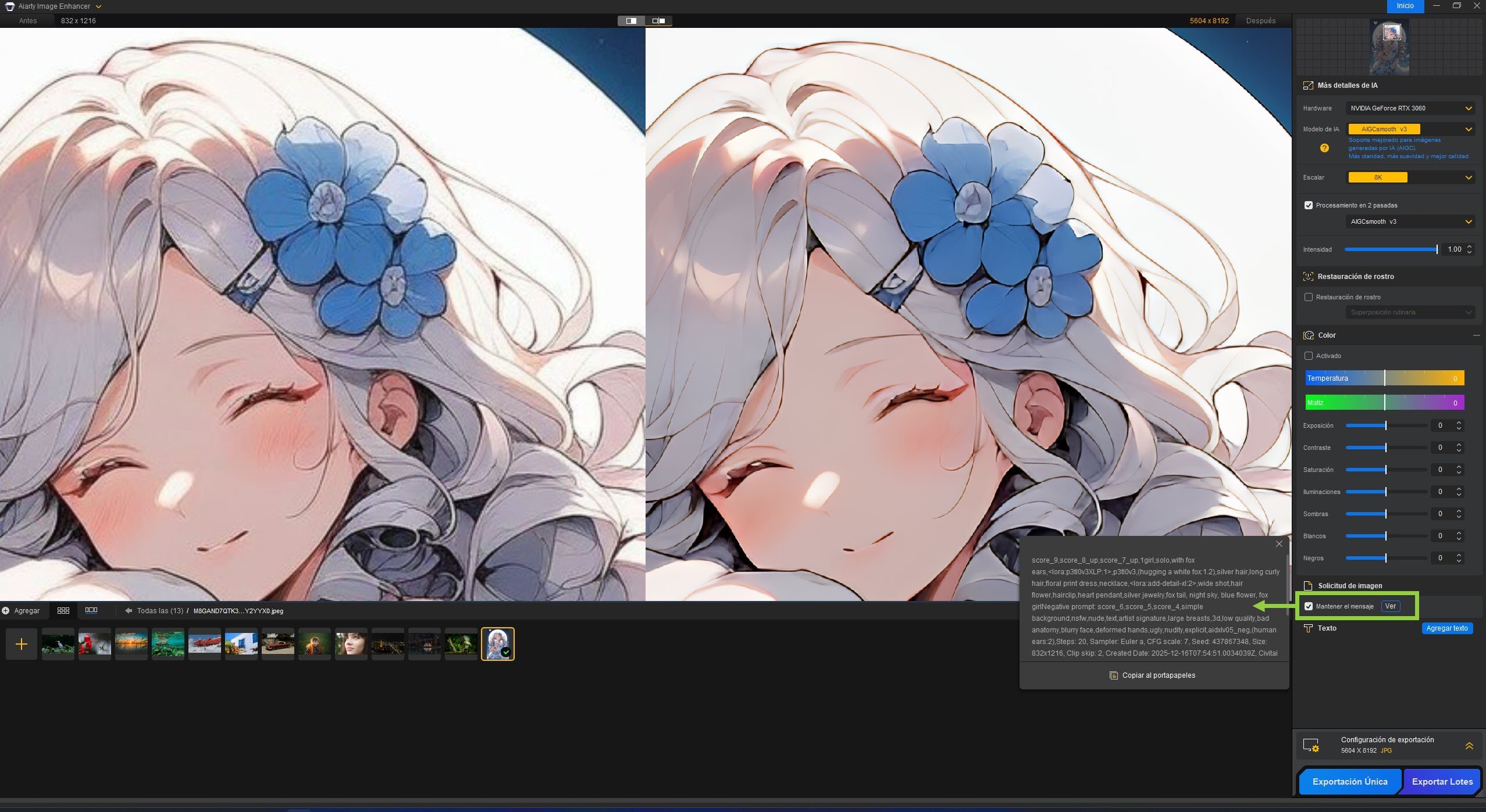 Si exportas la imagen en formato PNG, puedes volver a importarla en Aiarty Image Enhancer o usar otra herramienta compatible para ver los metadatos del prompt.