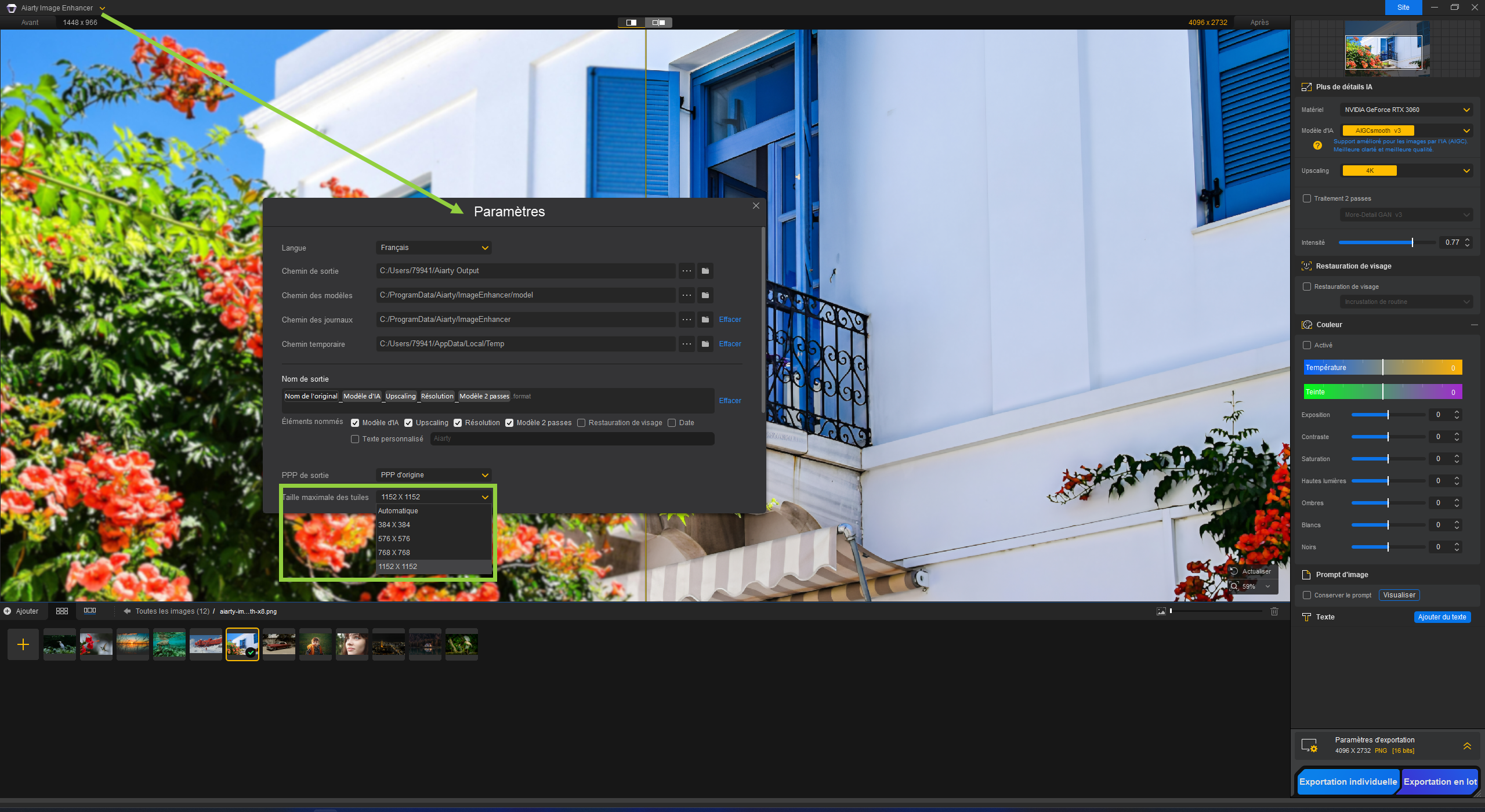Vous pouvez ajuster la Taille maximale des tuiles dans les paramètres pour équilibrer vitesse, usage mémoire et qualité de sortie selon votre matériel et la taille de l’image.
