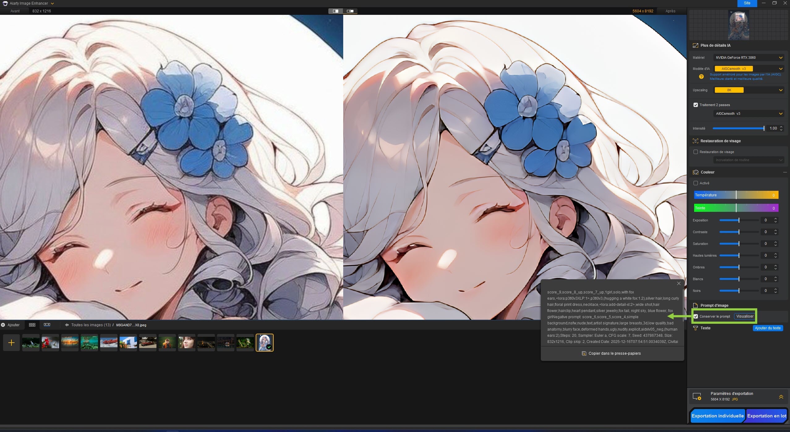 Si vous exportez l’image au format PNG, vous pouvez la réimporter dans Aiarty Image Enhancer ou utiliser un autre outil compatible pour consulter les métadonnées de prompt.