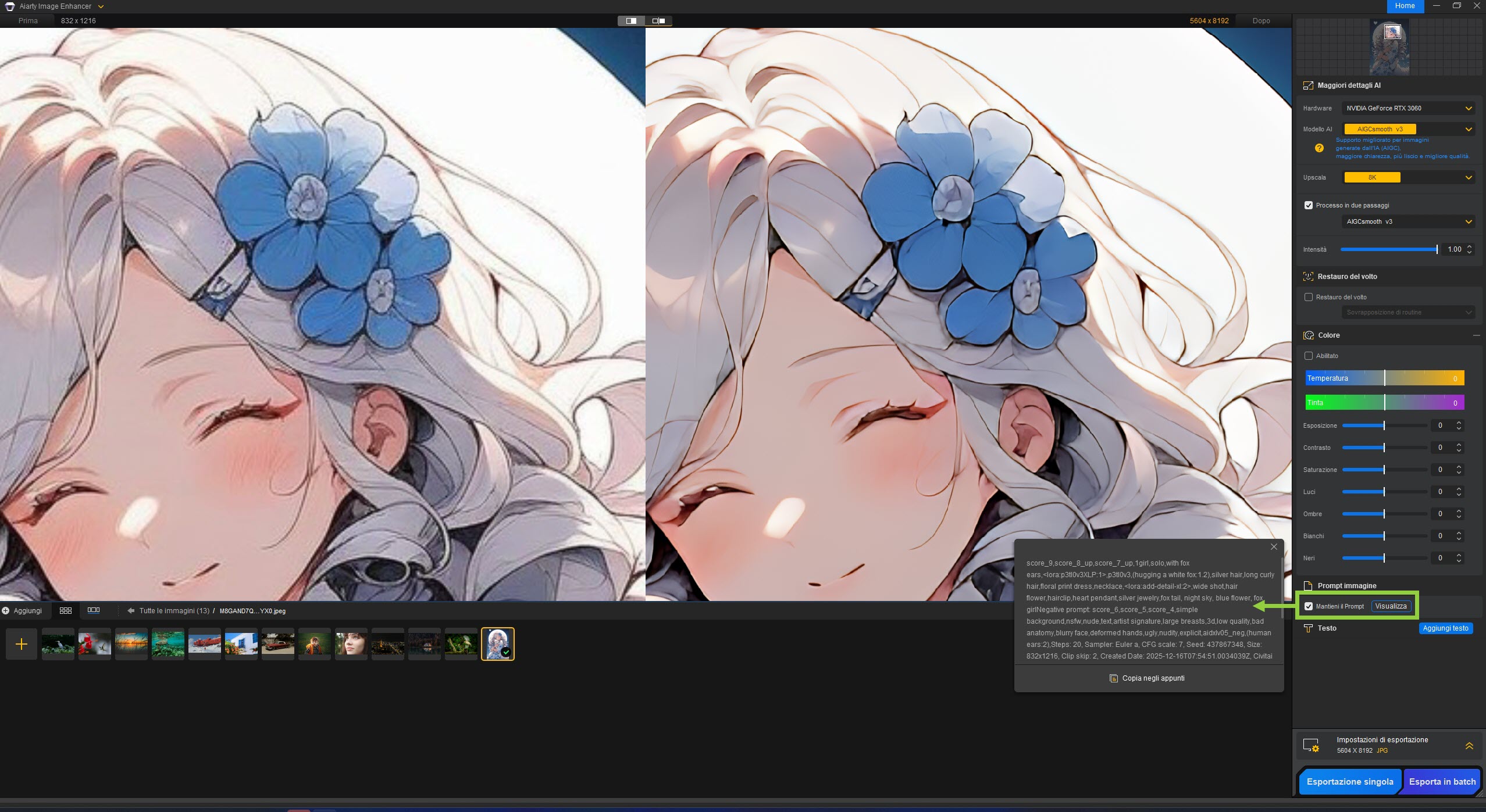 Se esporti l’immagine in formato PNG, puoi reimportarla in Aiarty Image Enhancer o usare un altro strumento compatibile per visualizzare i metadati del prompt.