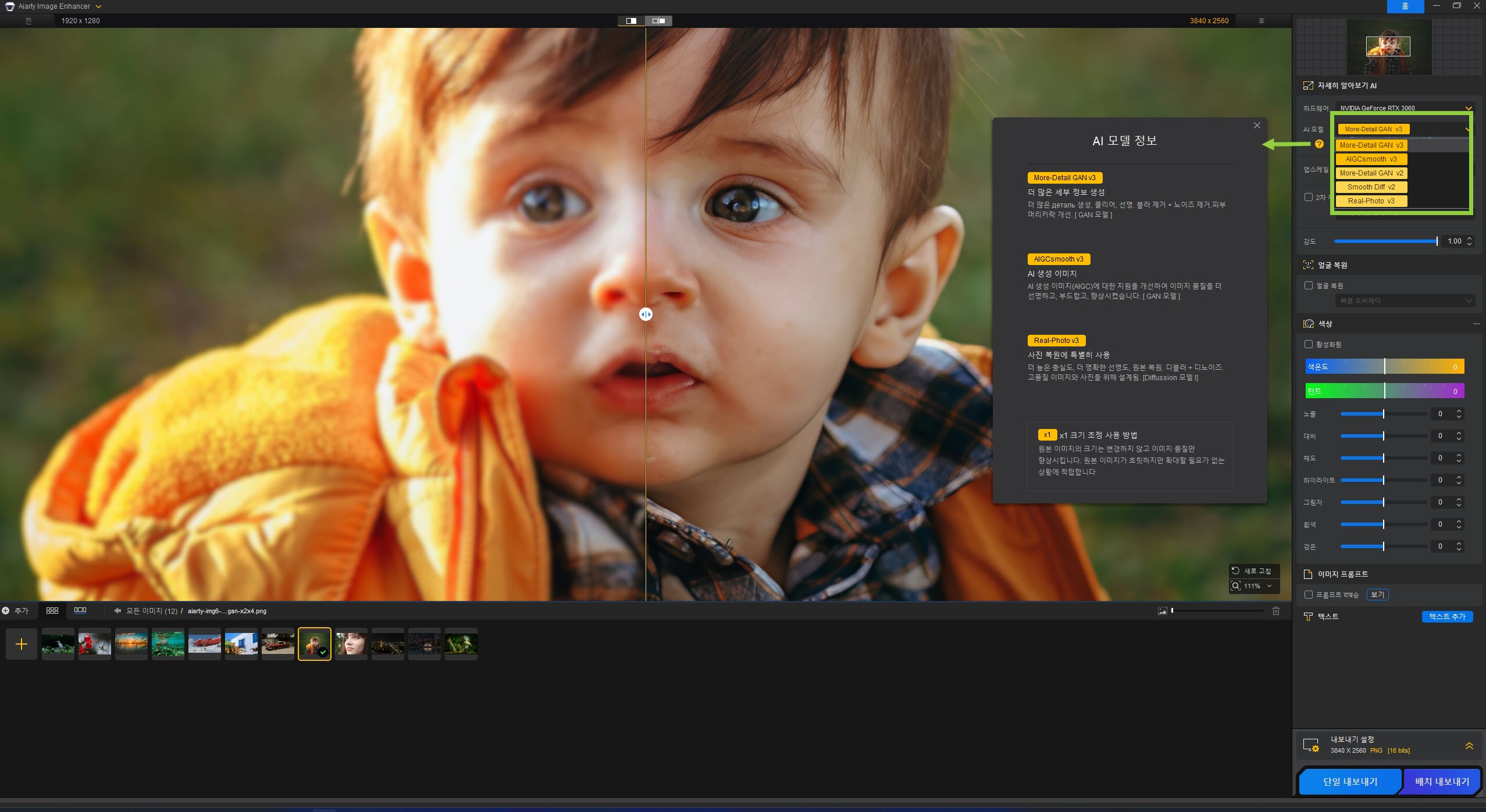 모든 상황에 맞는 '최고의' 모델은 없습니다. 각 AI 모델은 다른 시나리오에서 탁월한 성능을 발휘합니다. 특정 사진에 가장 적합한 모델을 찾기 위해 각각 사용해 보시는 것을 권장합니다. 동일한 모델이라도 x2, x4, x8, 또는 4K/8K 직접 업스케일과 같은 옵션을 선택하면 다른 결과가 나올 수 있음을 유의하십시오.