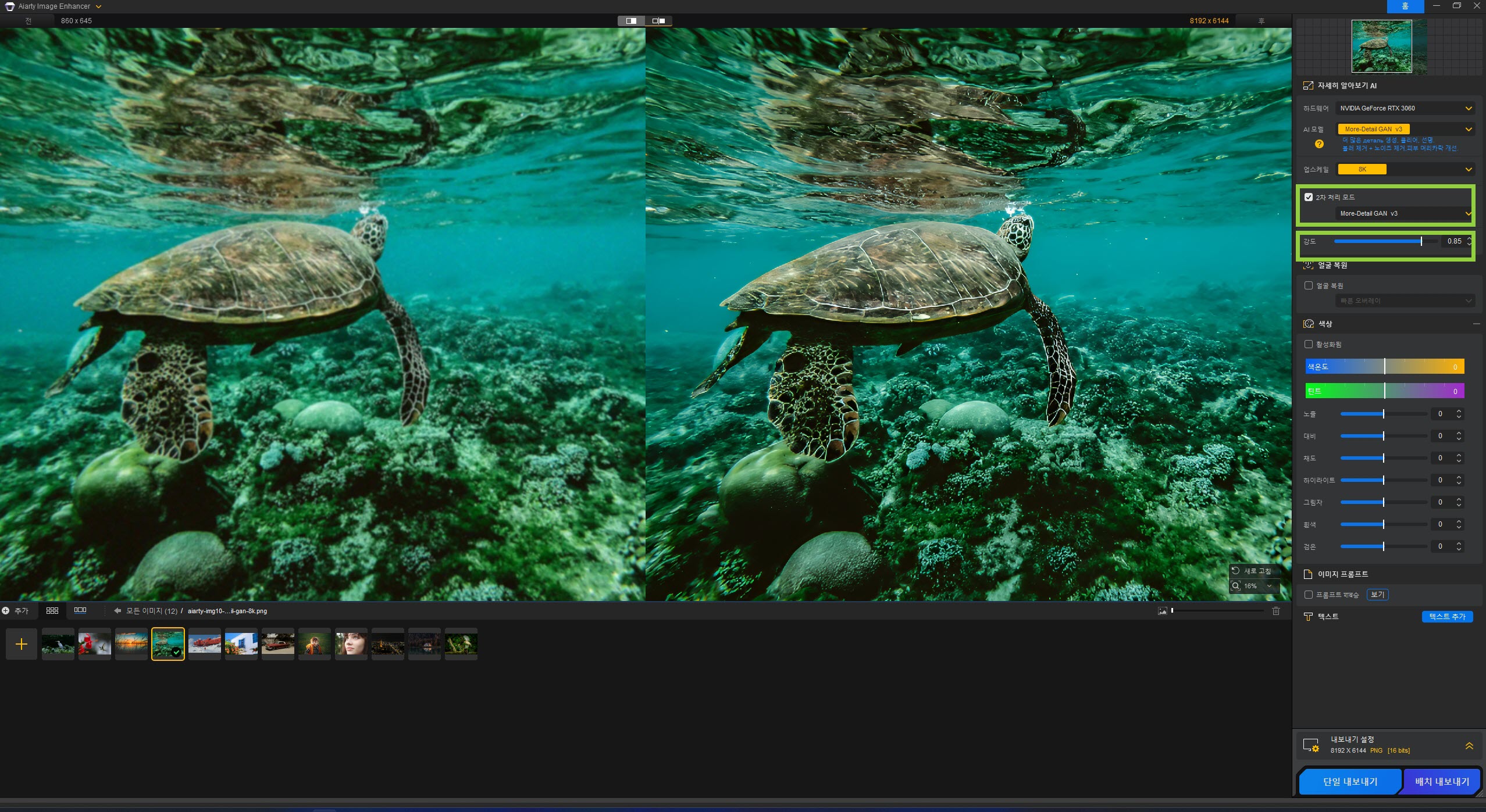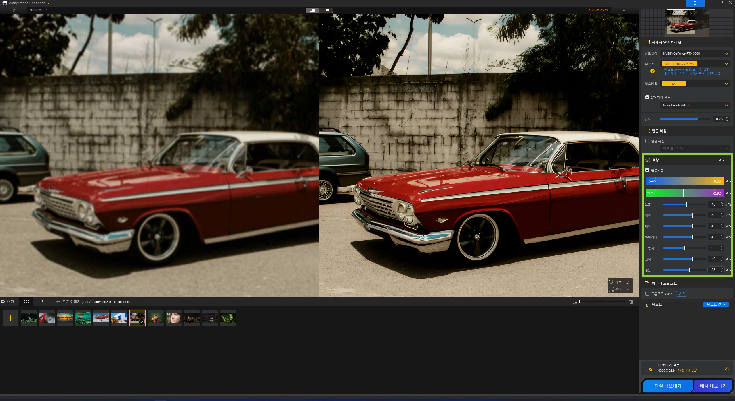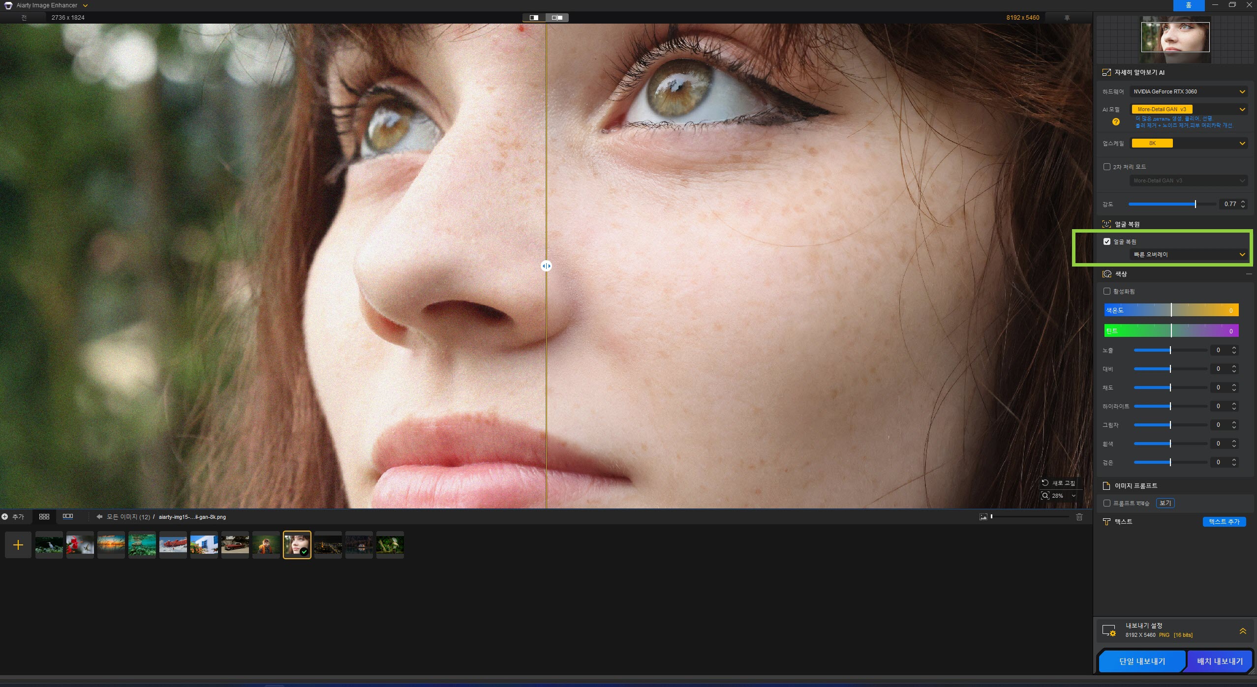 ▪ Strength조절로 밸런스 맞추기: Strength슬라이더를 활용해 AI 향상 및 선명도 강도를 세밀하게 조절하며, 이미지의 선명도와 자연스러움 사이의 균형을 맞출 수 있습니다.