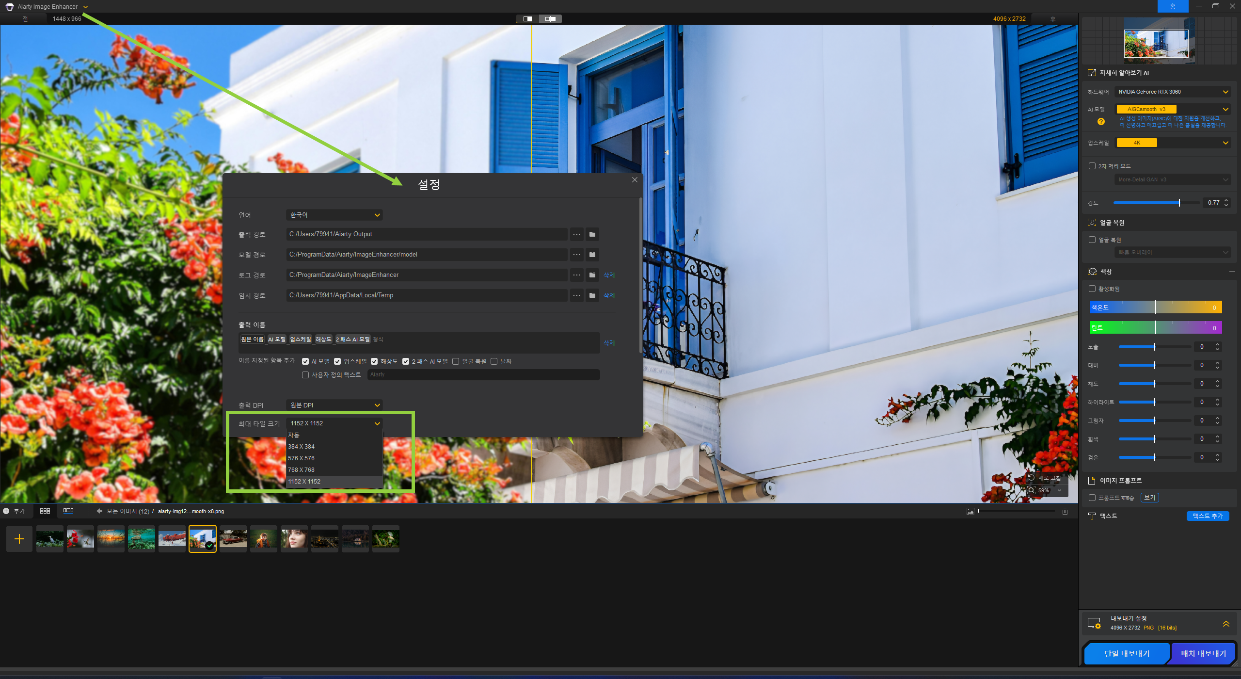 최대 타일 크기 설정을 조절해 하드웨어 성능과 이미지 크기에 맞게 속도, 메모리 사용량, 출력 품질 간 균형을 맞출 수 있습니다.
