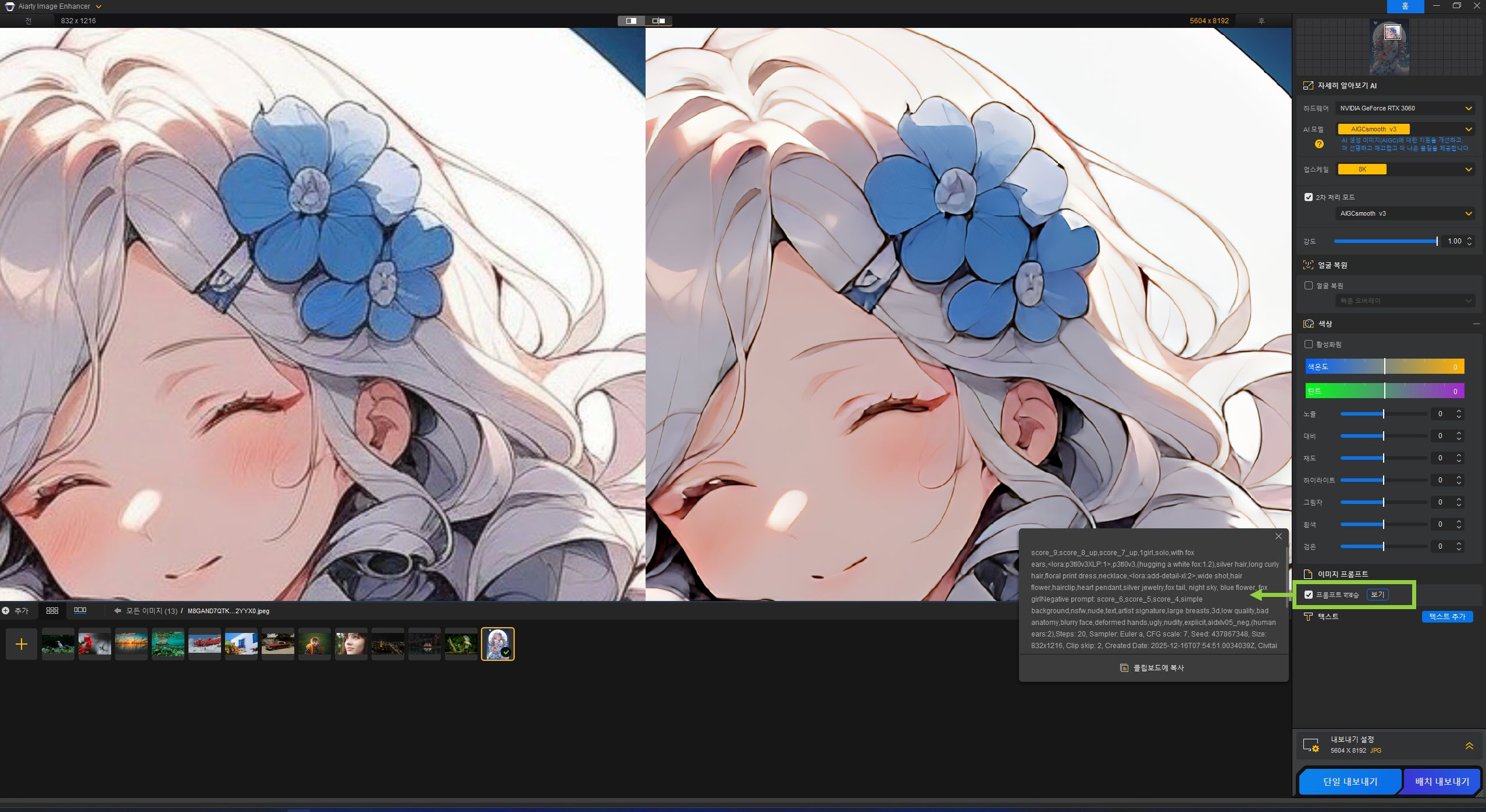 PNG 형식으로 내보낸 경우 Aiarty Image Enhancer나 다른 호환 도구로 다시 불러와 프롬프트 메타데이터를 볼 수 있습니다.