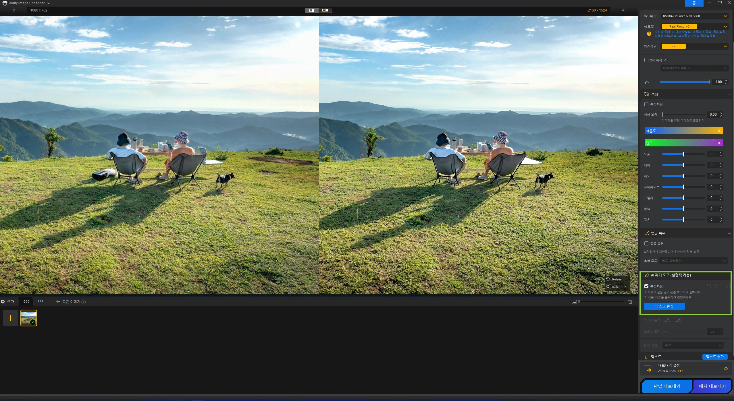 ▪ Strength조절로 밸런스 맞추기: Strength슬라이더를 활용해 AI 향상 및 선명도 강도를 세밀하게 조절하며, 이미지의 선명도와 자연스러움 사이의 균형을 맞출 수 있습니다.