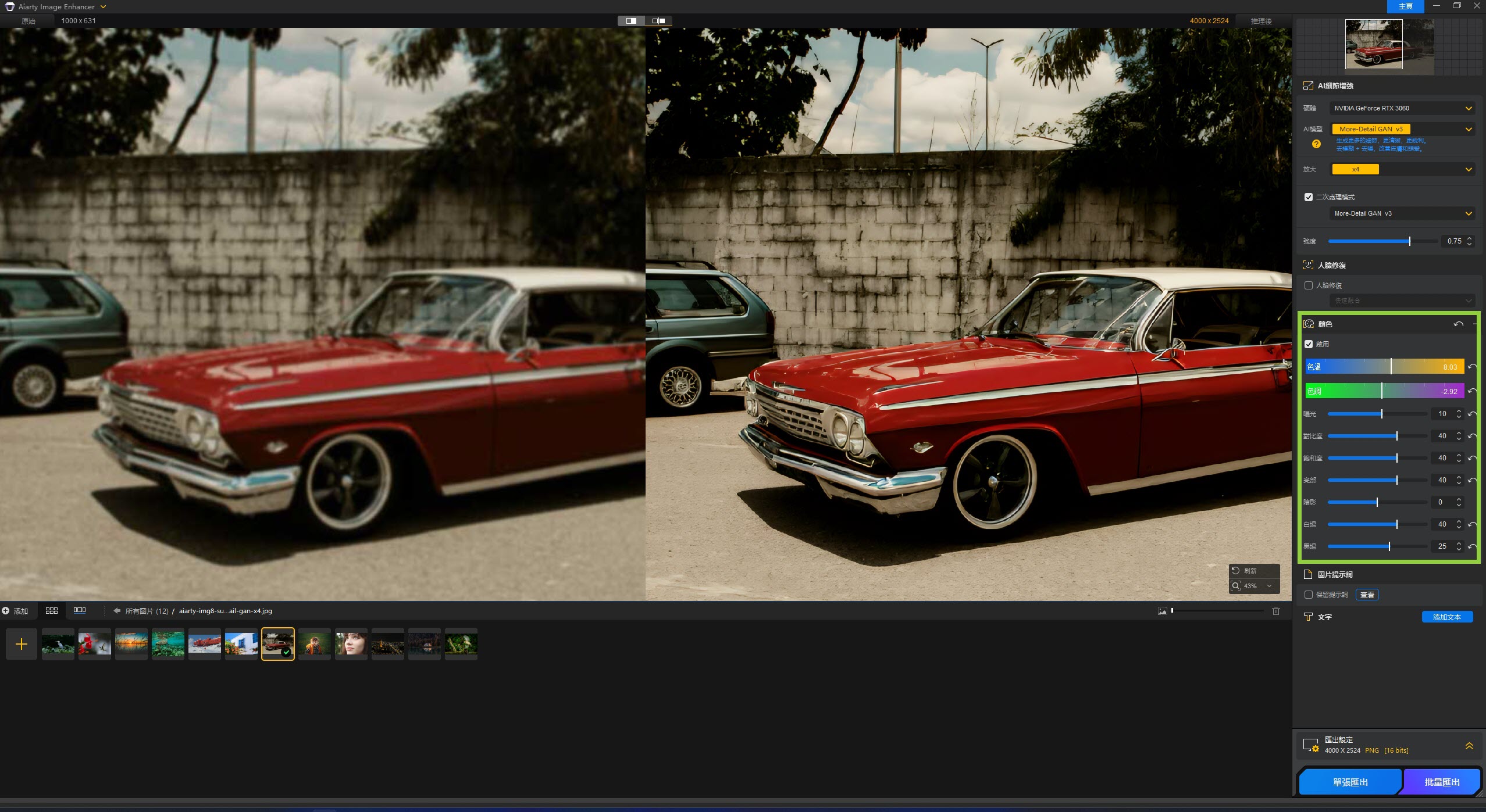 Aiarty Image Enhancer 的色彩工具讓您調整與微調色彩、亮度、對比度及白平衡,達成自然、準確且真實的效果。只需啟用功能,並使用滑桿修正因拍攝環境光線或相機設定導致的色彩失衡或失真。