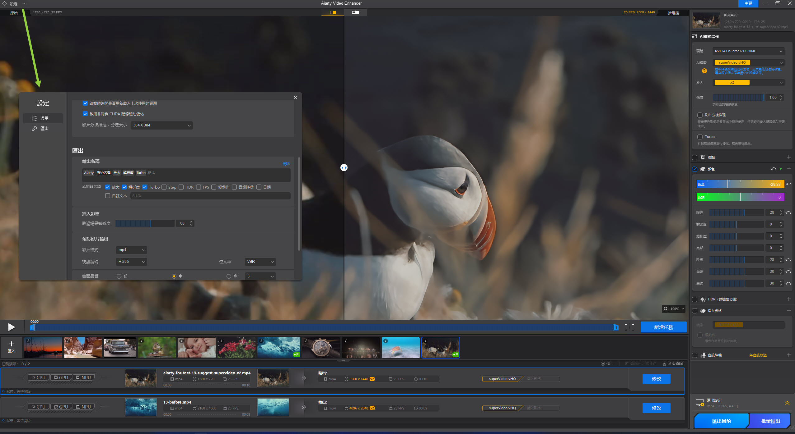 點擊介面左上角的「設定」,即可調整輸出/模型路徑、影片分塊推理 - 分塊大小、輸出名稱、插入影格場景靈敏度、預設影像/音訊輸出,以及影片編碼所使用的 GPU。這些設定可儲存為設定檔,方便日後快速套用。