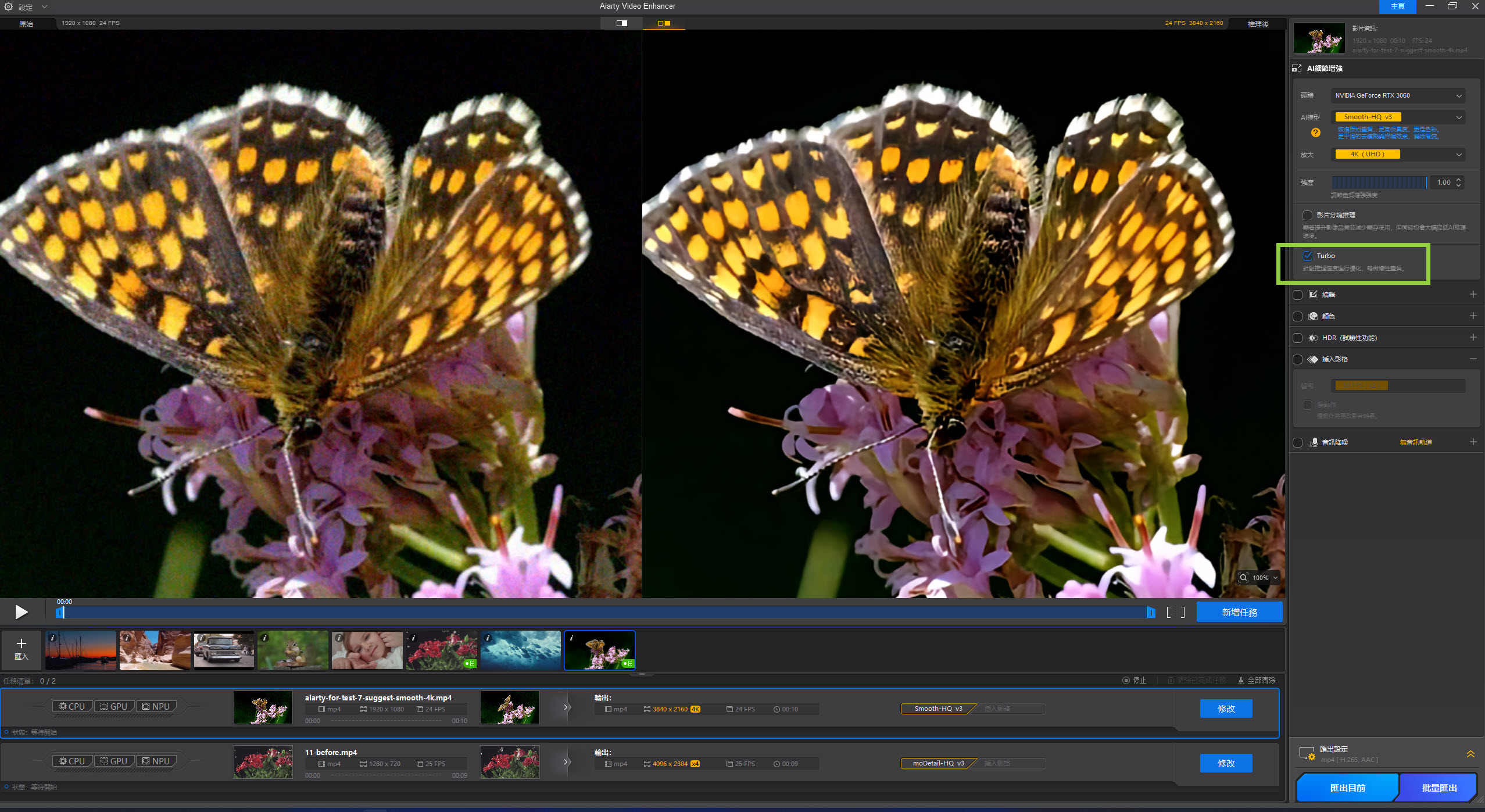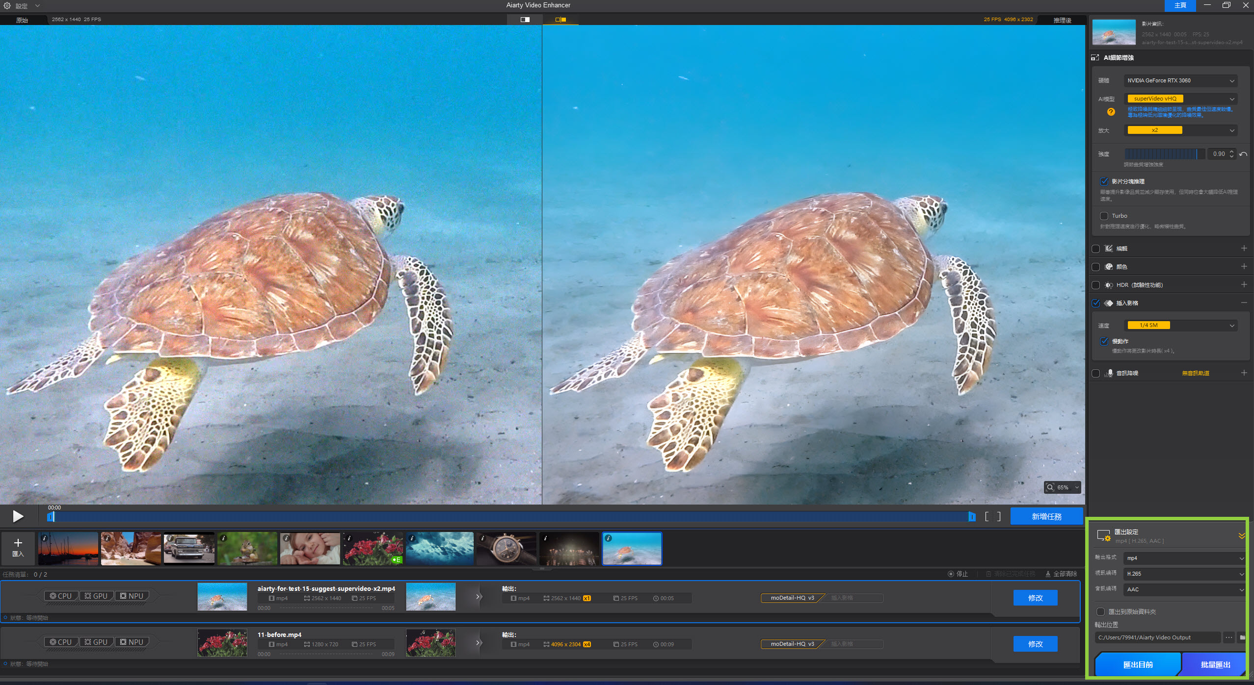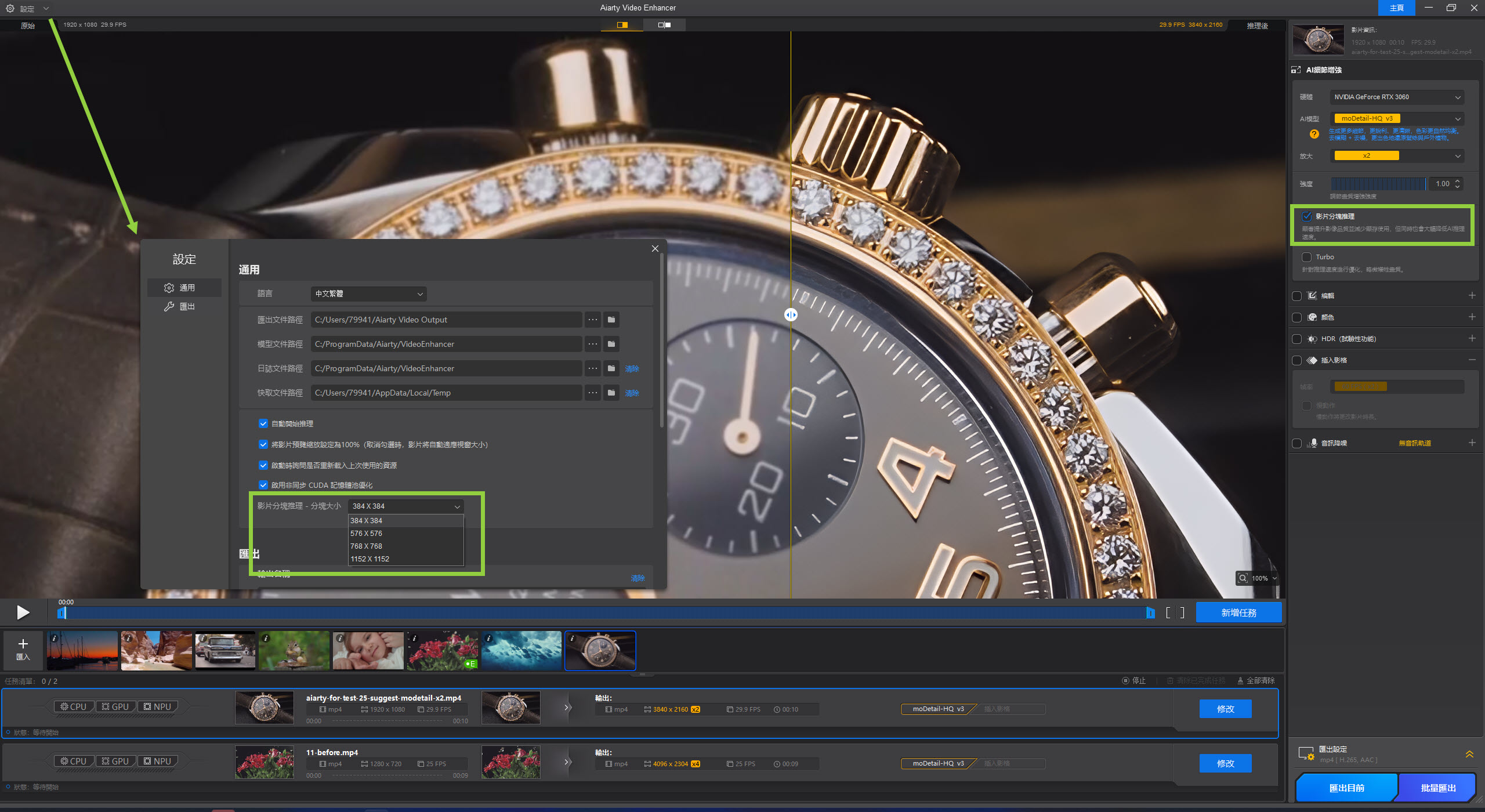 針對高解析度影片,影片分塊推理 透過分割區塊進行 AI 推論,可進一步提升清晰度與細節,同時大幅降低顯示卡記憶體(VRAM)使用量並維持畫面一致性。雖然速度比 Turbo 模式慢,但對困難素材能帶來更乾淨的成果。